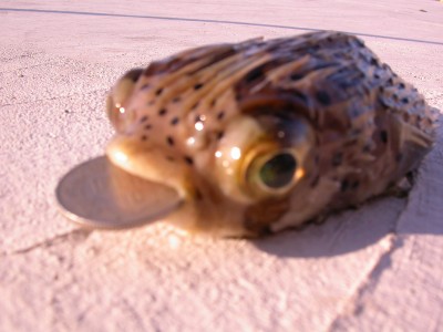 <br />在澎湖,啥都缺,就是海水不缺 (水族館大哥講的話)<br /><br />在我們釣的港口,啥不多,就是....<br /><br /><!-- more -->就是河豚多,囧<br /><br />不過赤崁更多,簡直是河豚的大宅院,<br /><br />不過不確定是否受到寒害影響,今年的河豚都不生氣膨脹<br /><br />缺少了那份可愛,而且凶悍的河豚總喜歡咖咖咖的咬著嘴,<br /><br />因此我讓它變成....<br /><br />↓ 金錢豚~~ OH YA<br /><br />很招財唷,而且眼睛大大的好可愛<br /><a target="_blank" href="http://www.pixnet.net/photo/returnbool/95179338"><img src="http://pic.pimg.tw/returnbool/1215315493.jpg" border="0" /></a><br /><br />ps. 我有放生唷。<br /><br />